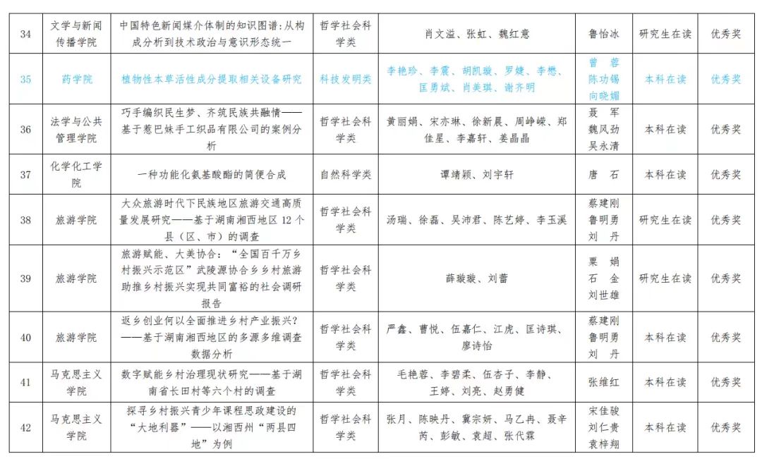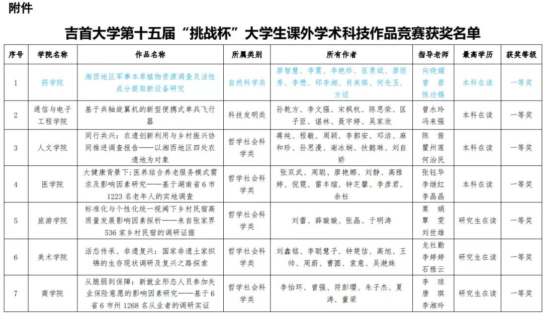 近日学校发布表彰文件,表彰在304am永利集团第十五届”挑战杯“老员工课外学术科技作品竞赛中获奖的单位和团队,公司师生荣获一等奖1项,优秀奖1项。其中《湘西地区军事本草植物资源调查及活性成分提取新设备研究》(廖智慧、李震、李艳珍、匡勇斌、廖丽秀、李懋、邱李湘、肖美琪、何先玉、方迢;指导老师向晓媚、曾蓉、陈功锡)荣获一等奖;植物性本草活性成分提取相关设备研究(李艳珍、李震、胡凯璇、罗婕、李懋、匡勇斌、肖美琪、谢齐明;指导老师曾蓉、陈功锡、向晓媚)荣获优秀奖,其中《湘西地区军事本草植物资源调查及活性成分提取新设备研究》推荐进入省赛。