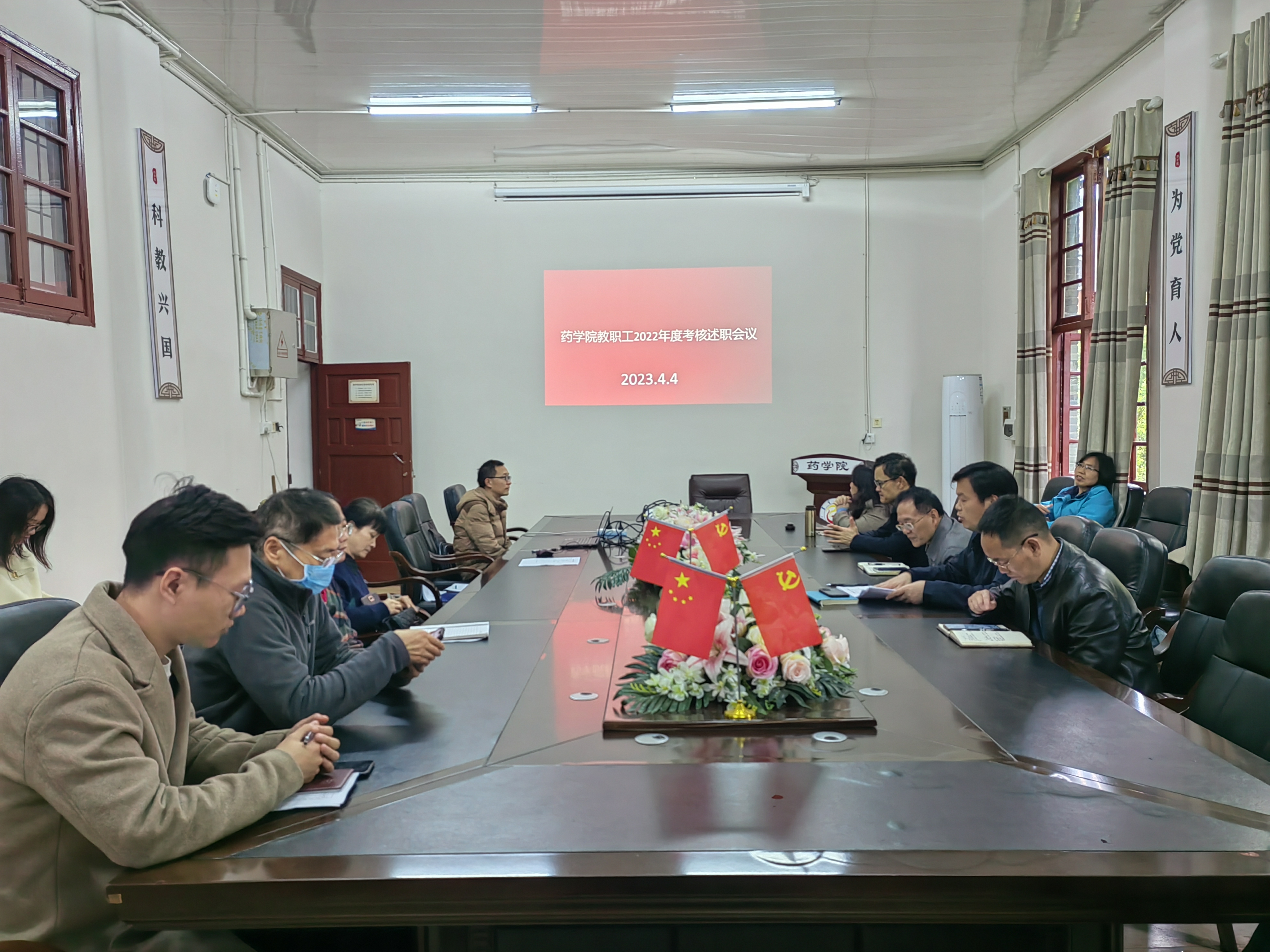 图为 药学召开教职工2022年度考核述职会议。