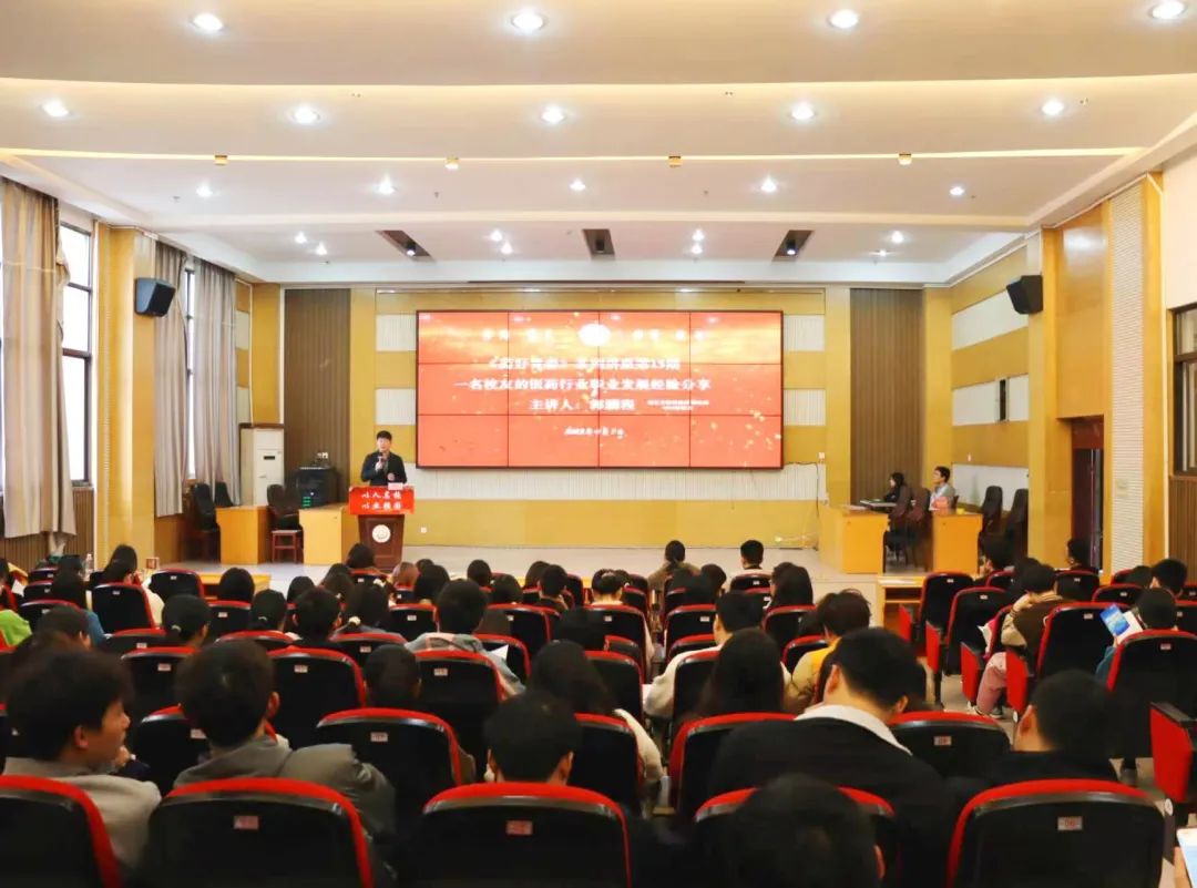 郭鹏程表示再次回到母校心情十分激动忐忑,他深深地被现场的氛围感染,随后他向学弟学妹们讲述了自己的毕业经历和职业生涯心路历程并提出两点希望,首先,希望他们积极关注企业的发展与规划,在入职前判断是否与自己的工作目标符合;其次,希望自己的经历能够在职业规划方面给予他们更多的启示。